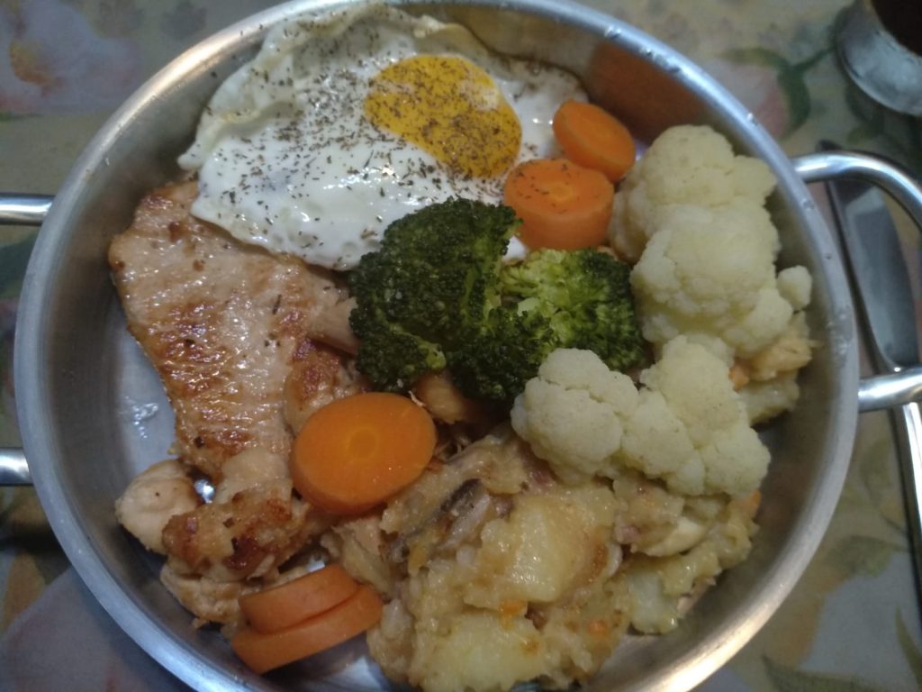 On the picture here you see a pan-fried Pork Cutlet, steamed Broccoli, Cauliflower and Carrots, Potatoes fried with Onions and a sunny-side up Egg with Herbs de Provence. This combined with a glass of Kombucha is a nice Sunday Lunch.