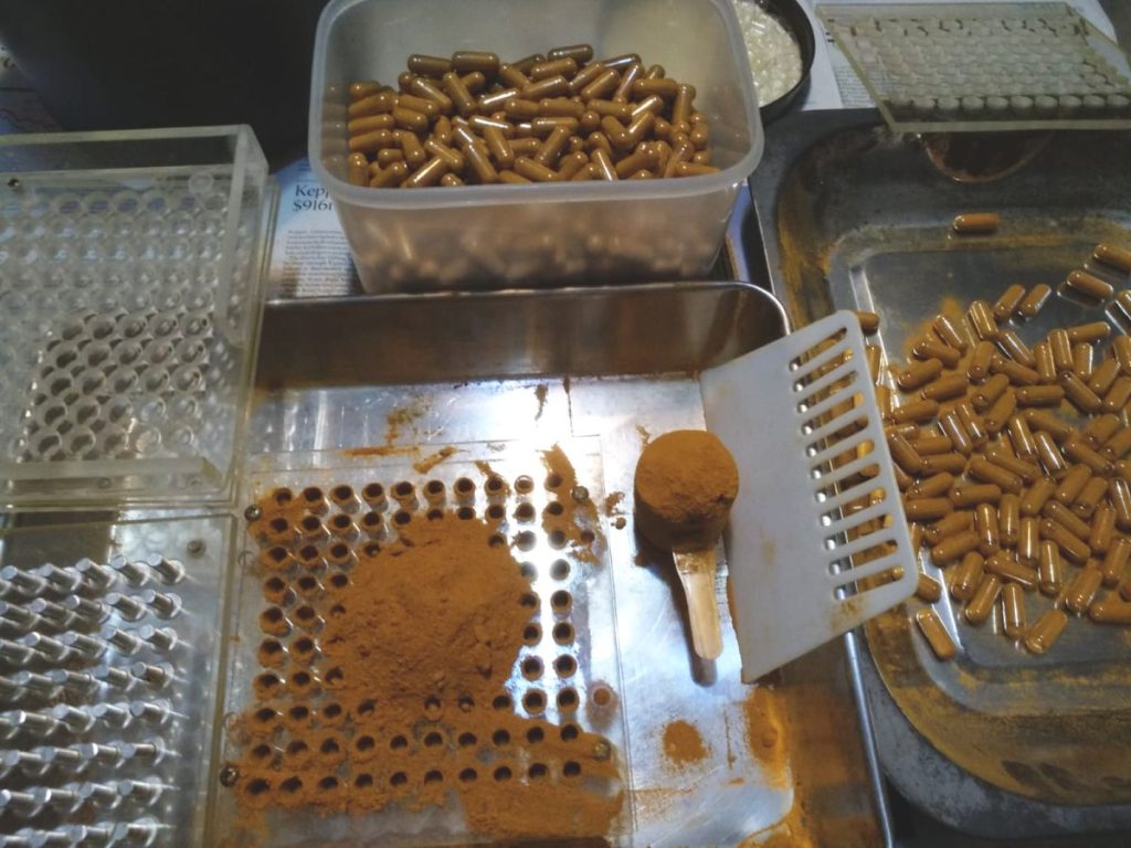 Since 2016 we make regular batches of abt 2000 large Capsules filled with Turmeric, Ginger, Garlic, Pepper and more, and take them daily. Mona is helping in the manual batch manufacturing of 100pcs at a time. We do this for our own consumption (and a few friends 😉