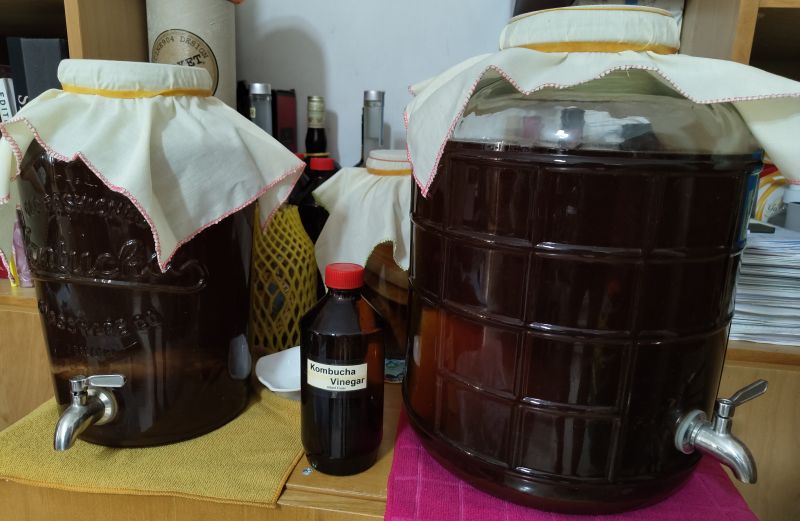 It was in 2018 when I started to ferment Kombucha, to have another healthy compagnion to the Sauerkraut. Since then I make regularly Kombucha, at home (left side is 8 liter, right is 20 liter fermenter) and at the office (there is another 10 liter), and our family drinks at least a glass of fresh home-made unaltered natural Kombucha a day.