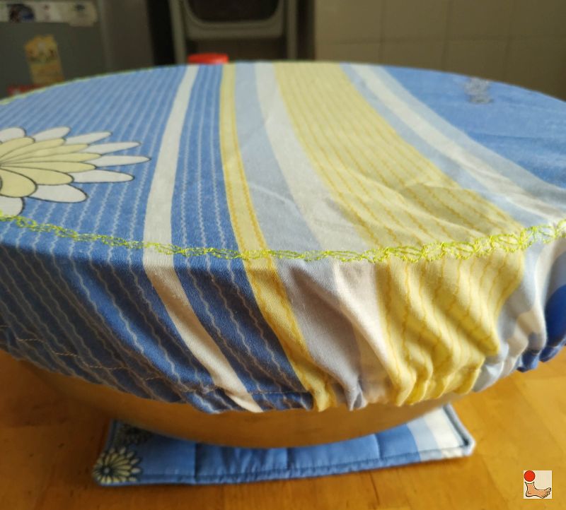 For that purpose I made this cute Bowl Cover, with an elastic band, that fits nicely to the big salad bowl. With it comes the same material saucer, so the metal bowl doesn’t scratch the table.