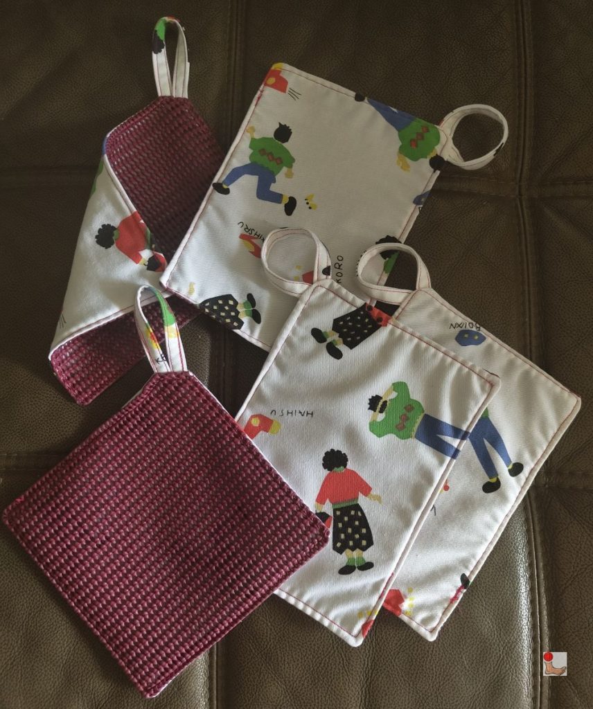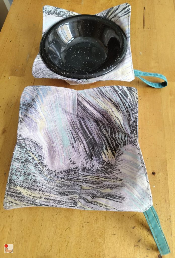 For this I created a number of such Bowl Cradles of different sizes. Holding them at the corners, and you can carry steaming hot bowls around with no problems. Safe and convenient. Between the two textile layers is a recycled towel layer. As usual, with hangers for hanging storage. As everything, of course these are all washable.