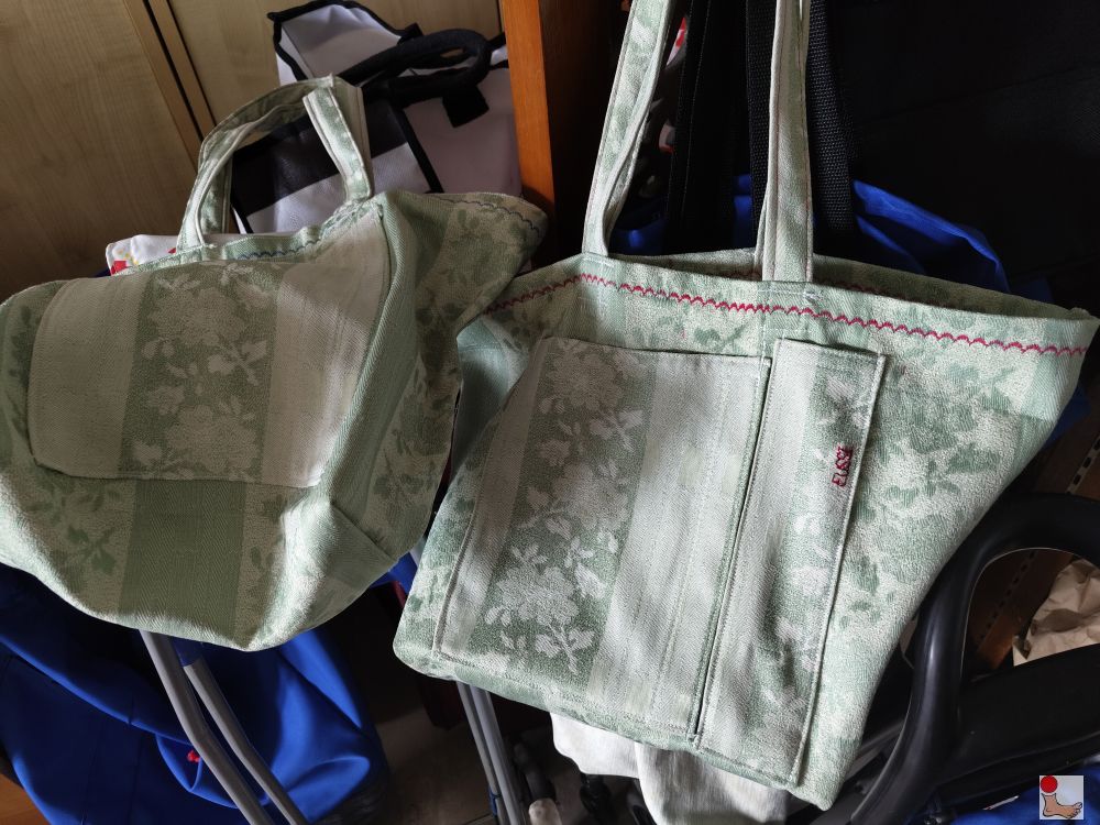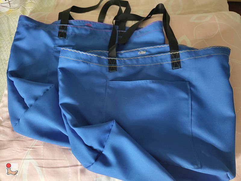 I made 6 (!) more of these bags, 38cm long, 18cm wide and 44cm high. Now definetly don’t need any plastic bags any more, with 8 such big shoping bags. Each has outside a pocket of 28cm x 28cm.
