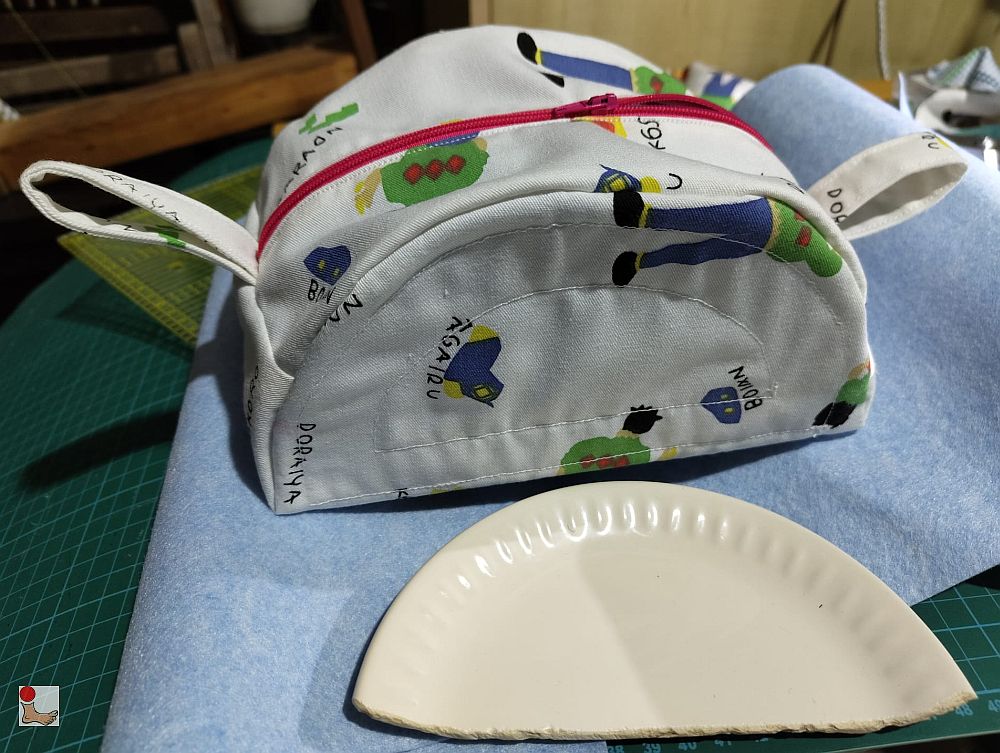 To keep them nicely and avoid them to get damaged during storage time, I created a pouch for them. A zippered pouch, 12cm deep, with 8 loose separations inside so the plates don’t touch each other. Stiffening material sewn inside for sides and bottom. And as you see, I like having lashes at the ends of zippers, these are strong enough to even carry the hole pouch on them. I love this design and look, a neat and nice home for the plates.
