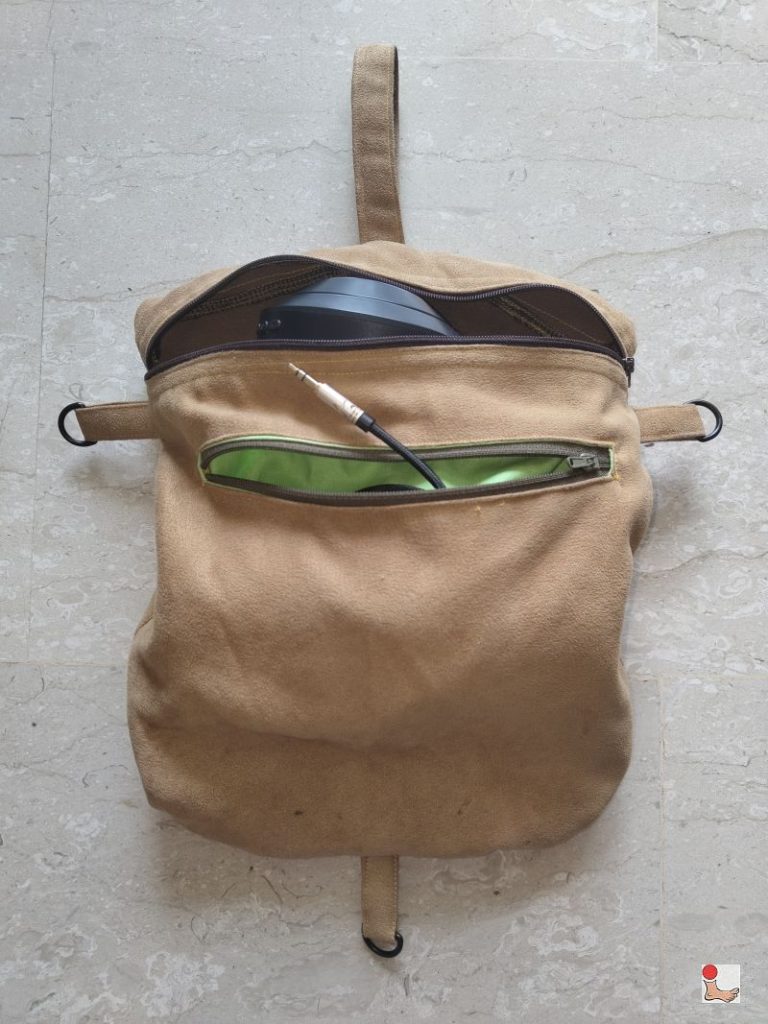 So I created this unlined bag. The main bag has a long zipper all across. Then I made in front an inserted quite big pocket with zipper. That inserted pocked with green inside goes all the way down and is for accessories.