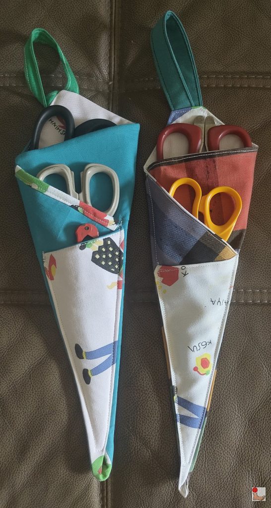 The left side is the first prototype, the right one is already a bit more advanced. Each is for 3 scissors. The left one has a rather thick padding material in between the two textile layers, while the right one has no extra padding.