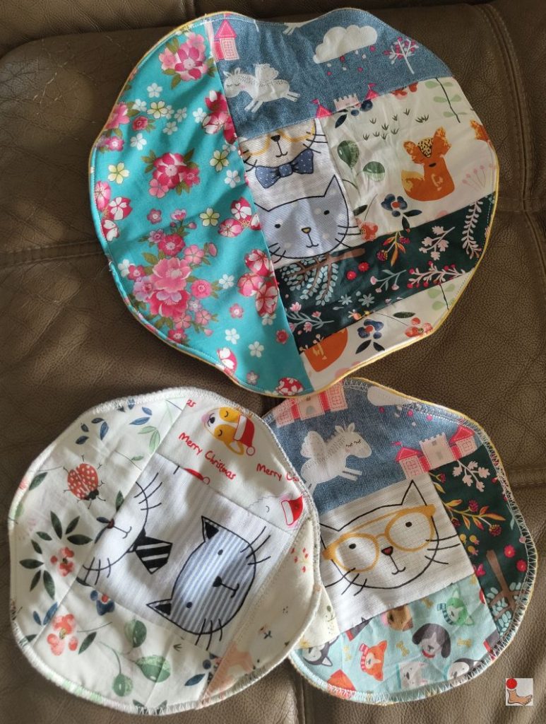 2 layers of recycled material, in between a layer of a towel, and ready are the saucers. Washable and made use of otherwise discharted clothe items. You can see from the finish, the smaller ones are the first prototypes, the larger one has already an a bit more professional look.