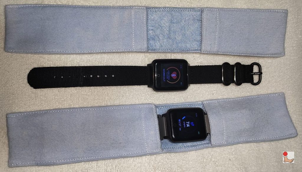 So I put this device in my socks around my ankle. But found out fast that the buckle for the band was not nice to my delicate skin. So I created a sleeve of a cosy soft flanel material with a stiffening inlay (the slightly darker material inside). Here I show two (one with Mona’s tracker). It wraps nicely around the leg and can be washed.