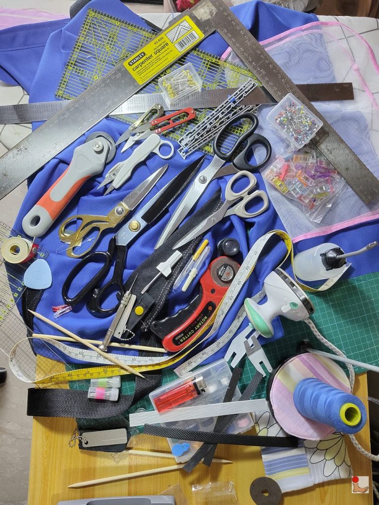 Most useful I find the sharpened chopsticks, for guiding material in the foot area. The needles and clips, the rulers and tapes, and the scissors and thread cutters. The scissors with the golden handle I got recently from our friend Irene Faber.